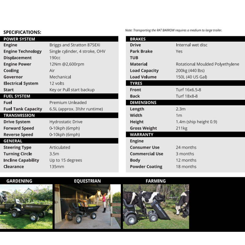 Rat barrows biggest feature is its simplicity. The key start Briggs and Stratton engine with automatic choke and fixed throttle means a quick start every time even on frosty mornings.