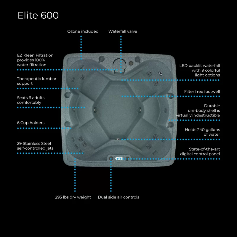 The AR-600 Elite by AquaRest Spas is a plug-n-play, roomy 6-person hot tub with a patented LED waterfall with 9 different color settings, 6 deep cup holders and factory installed AquaPure Ozone water purification system. The AR-600 Elite is powered by a 1.5hp Jacuzzi pump that provides soothing hydrotherapy through the 29 two-tone stainless steel, multi-level jets that target different muscle groups, including jets for your feet. AquaRest Spas are manufactured using state-of-the-art roto molding technology, producing an extremely durable and unbelievably portable hot tub. You can relax knowing that AquaRest Spas include an ASTM-certified locking safety cover and full foam insulation, making it extremely energy efficient and certified to meet the strict California Energy Commission (CEC) standards. The AR-600 Elite adheres to the “Simple, Portable, Durable, and Affordable” philosophy that has helped make AquaRest Spas the #1 manufacturer of hot tubs online. Residential Delivery and Factory Warranty included. Proudly Made in the USA!